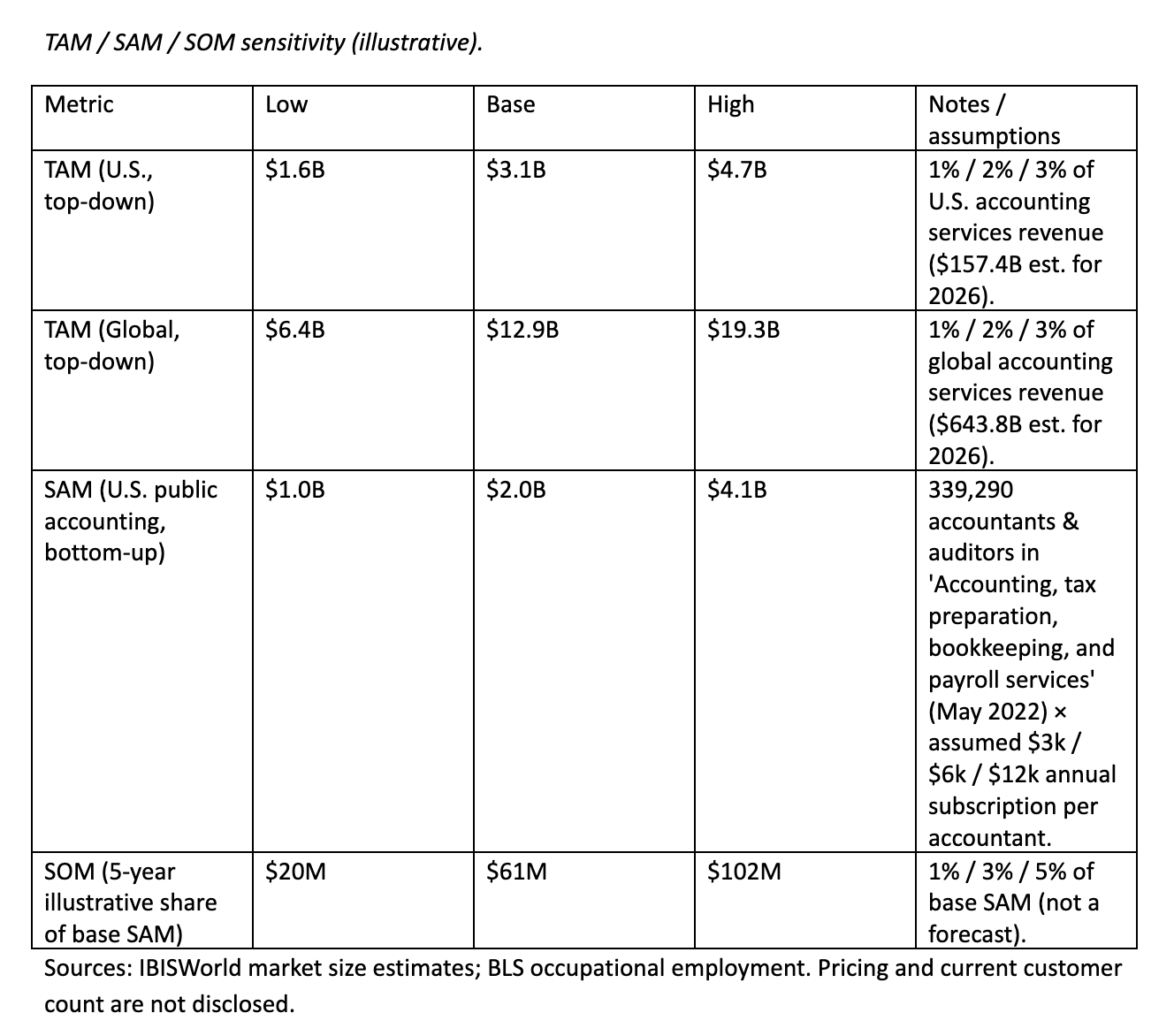 The underlying services market is huge: ~$157B (U.S.) and ~$644B (global) accounting services revenue (IBISWorld estimates). A plausible near-term SAM for a public-accounting-focused agent subscription can still be $1-4B, depending mostly on pricing and seat coverage assumptions. SOM is an execution question: distribution into firms, trust, and retention matter more than raw market size.