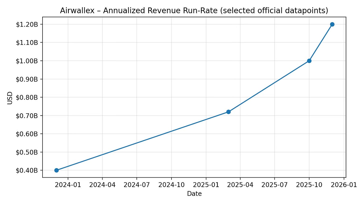 Airwallex’s reported revenue metrics are run-rate/annualised (not audited GAAP/IFRS group numbers). Still, the shape of the model is legible: