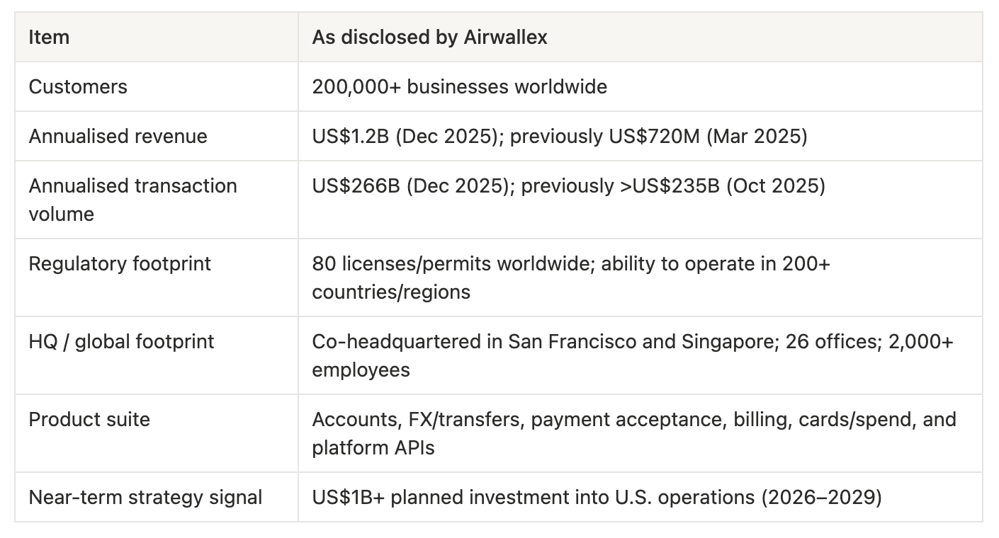 [9] Airwallex company overview: Who we are (metrics, timeline, licenses). https://www.airwallex.com/who-we-are (accessed 2026-01-26).