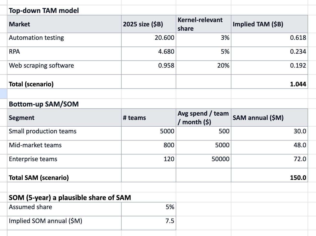 SOM (5‑year): choose a share of SAM that could plausibly be won given competition, sales motion, and product depth. A good SOM feels slightly uncomfortable, not “we’ll win 1% of the world,” but “we’ll win X% of the teams who truly need this.” Even a small market can compound if Kernel becomes a default utility with high retention, usage expansion, and pricing power.