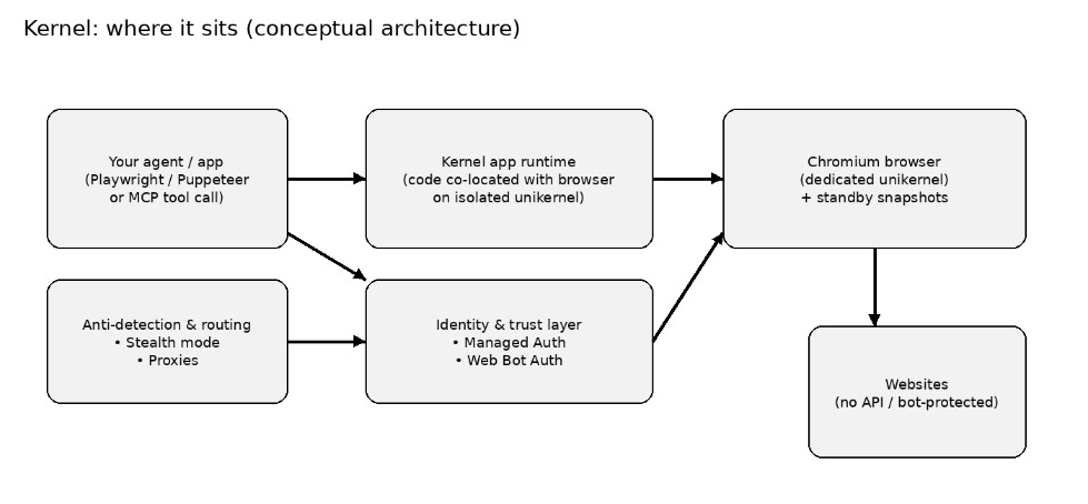 Your agent (Playwright/Puppeteer or MCP) calls Kernel.