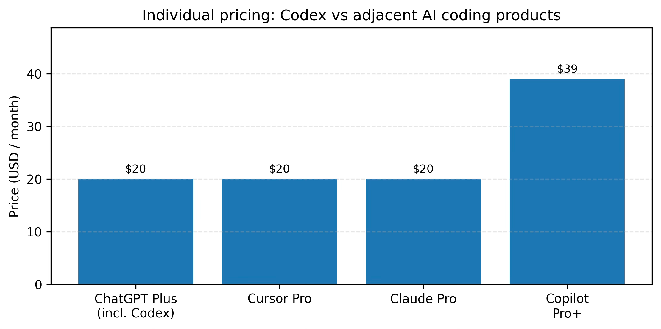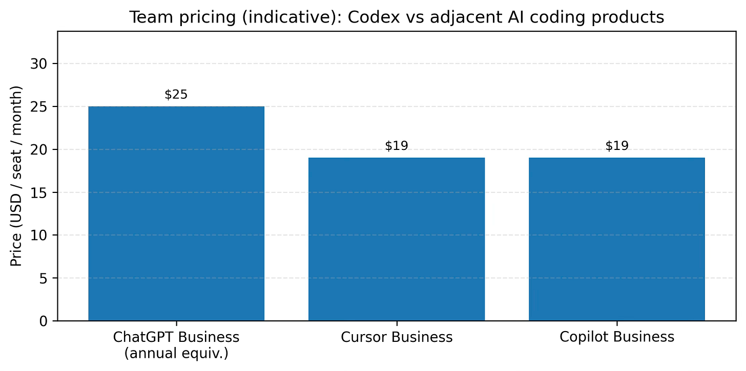 Codex is bundled across ChatGPT plan tiers, with overflow handled via credits. OpenAI’s public pricing anchors include: Plus $20/month; Pro $200/month; Business $25/seat/month billed annually ($30 monthly).