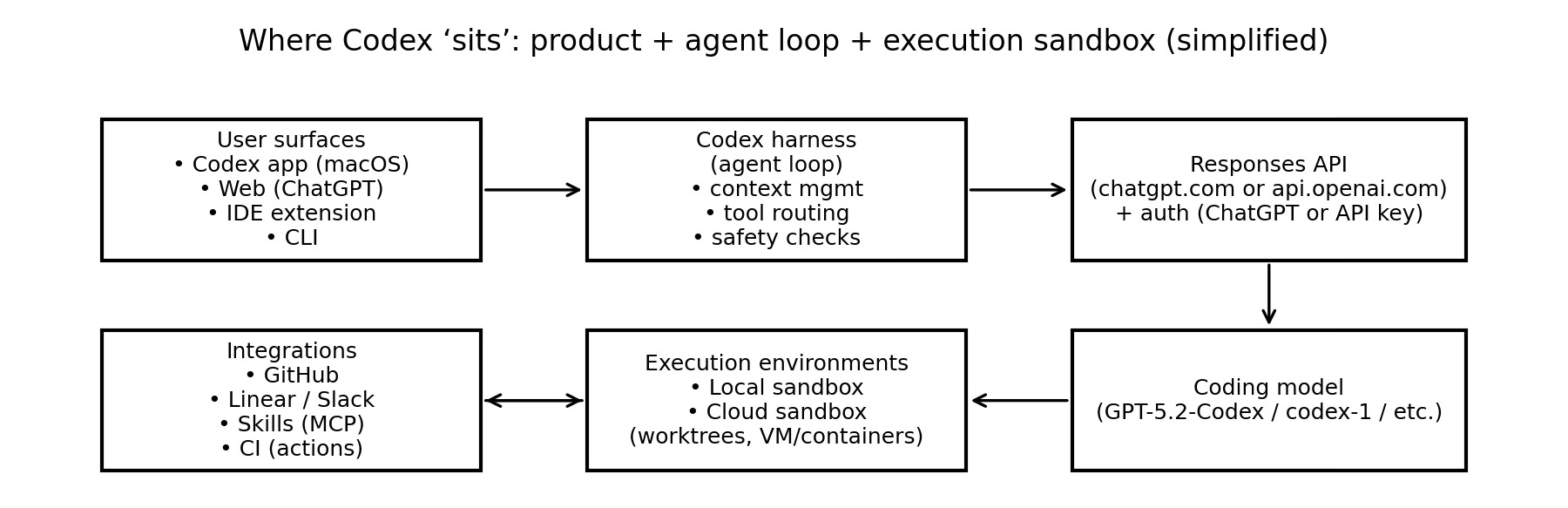 Codex sits between your intent and your repo/toolchain: it translates a natural-language task into an agent loop (plan → act → verify → summarize), executing inside sandboxes and integrating with Git/CI. The diagram below is a simplified view of the product surface area.