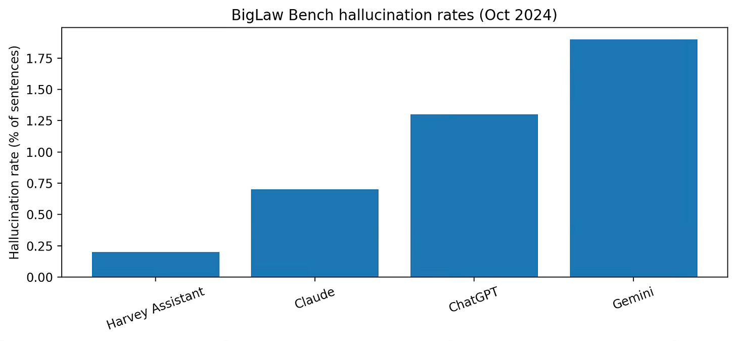 Harvey backs the ‘evaluation culture’ point with BigLaw Bench publications, including work on hallucination rates across model systems.