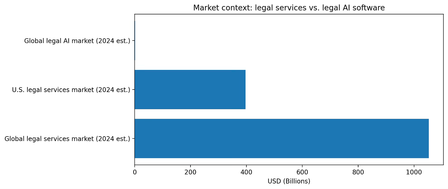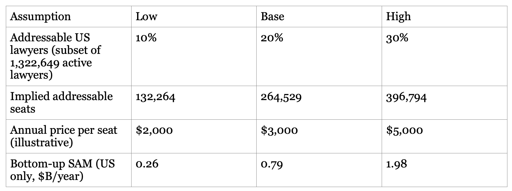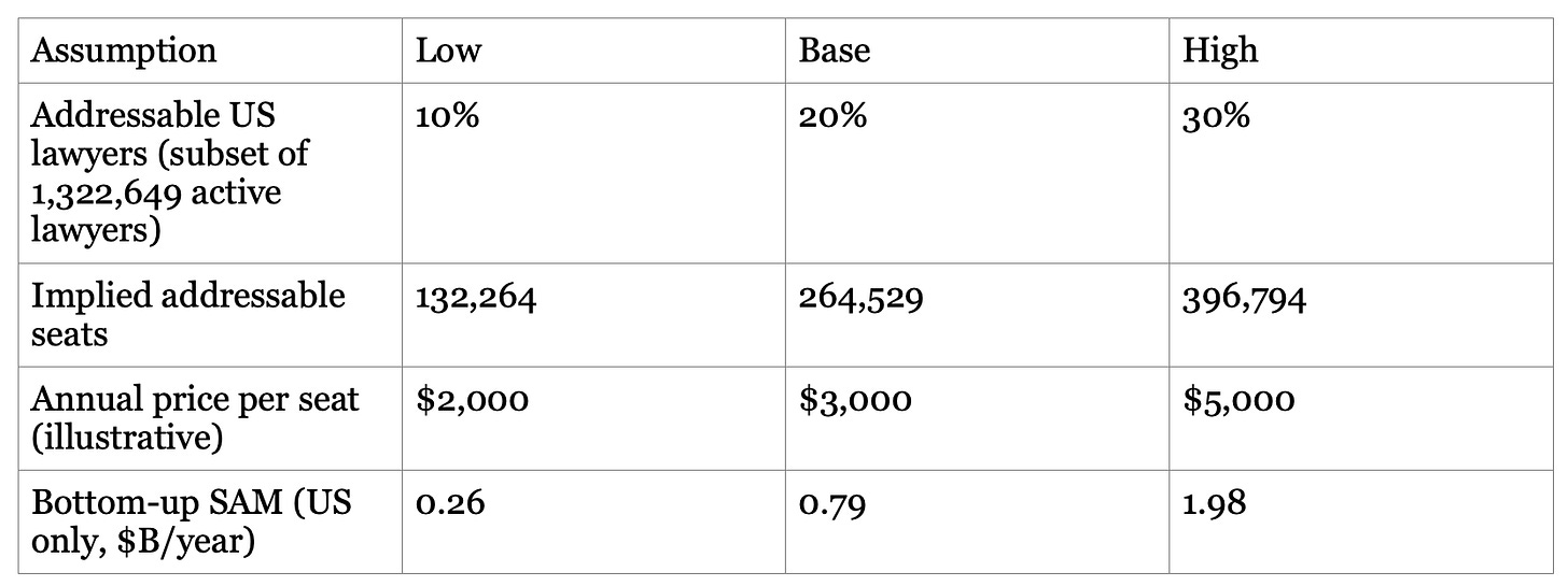 This SAM is conservative in one sense (U.S. only) and aggressive in another (it assumes a meaningful fraction of the profession becomes paid, active seats). If you extend to the global lawyer population (IBA cites 12M+ lawyers globally), the ceiling rises, but procurement and language/legal-system localization become the real constraints.