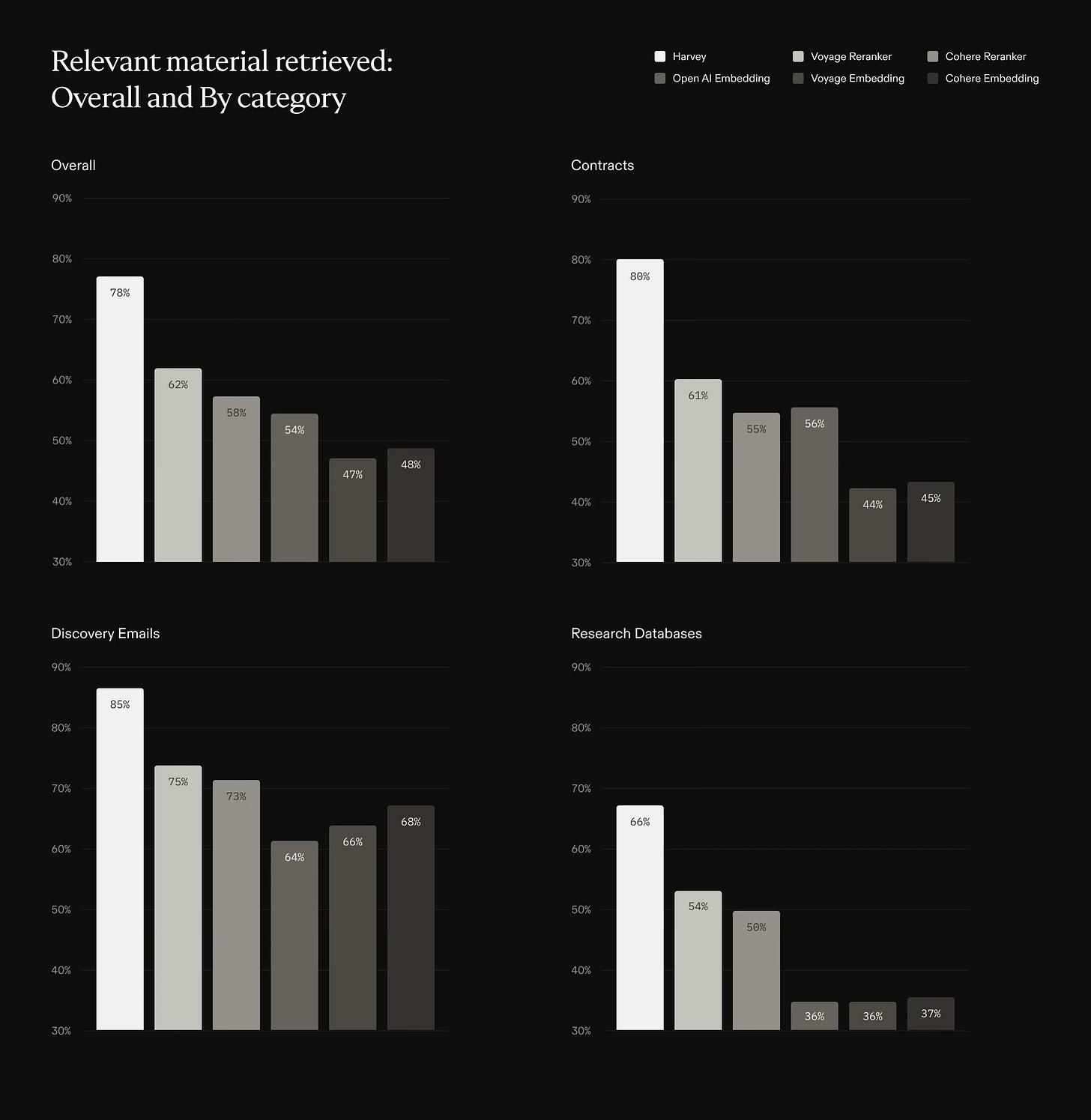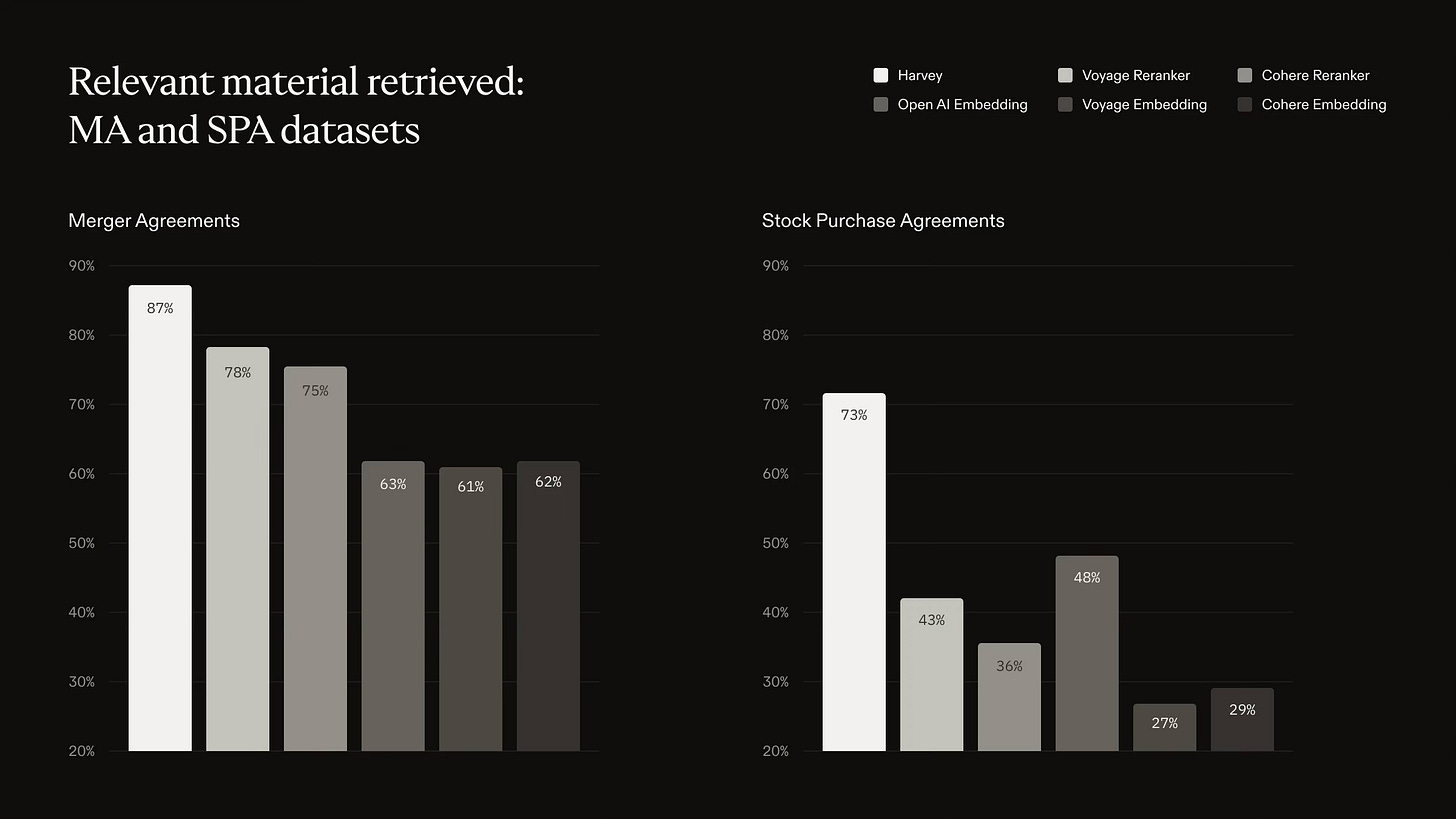 Harvey publishes benchmark results, including studies of retrieval quality (how well a system finds relevant material before answering). Below are official charts from Harvey’s BigLaw Bench retrieval publication.