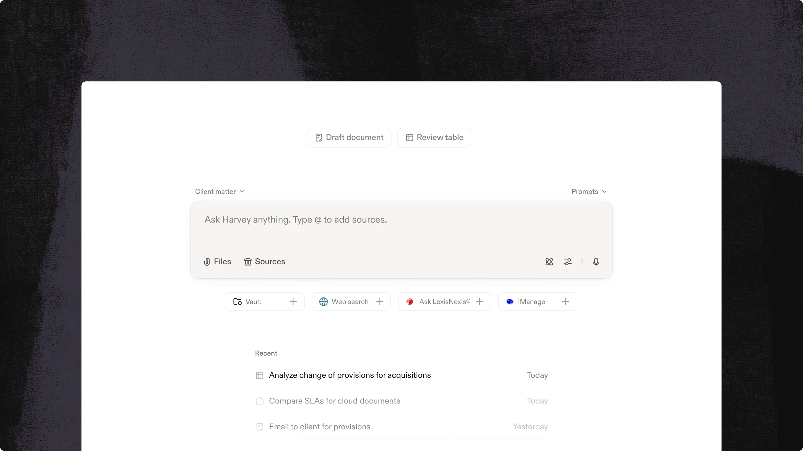 Harvey app: The core workspace for chat-style Q&A, deep analysis, and drafting.