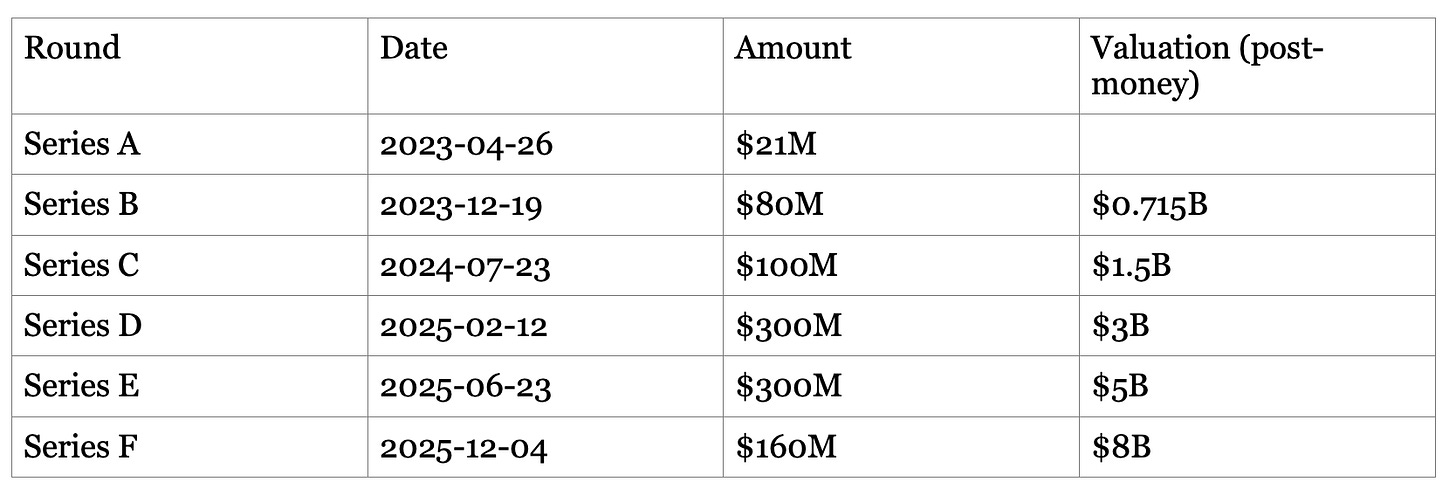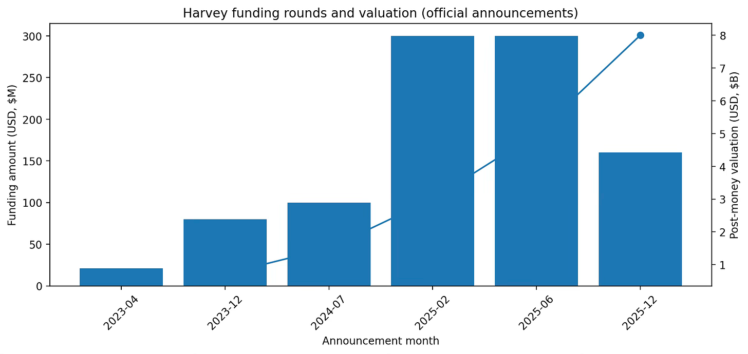 By summing announced rounds, Harvey has disclosed at least $961M raised across Series A–F (Apr 2023 through Dec 2025), with disclosed valuations rising from $715M (Series B) to $8B (Series F).