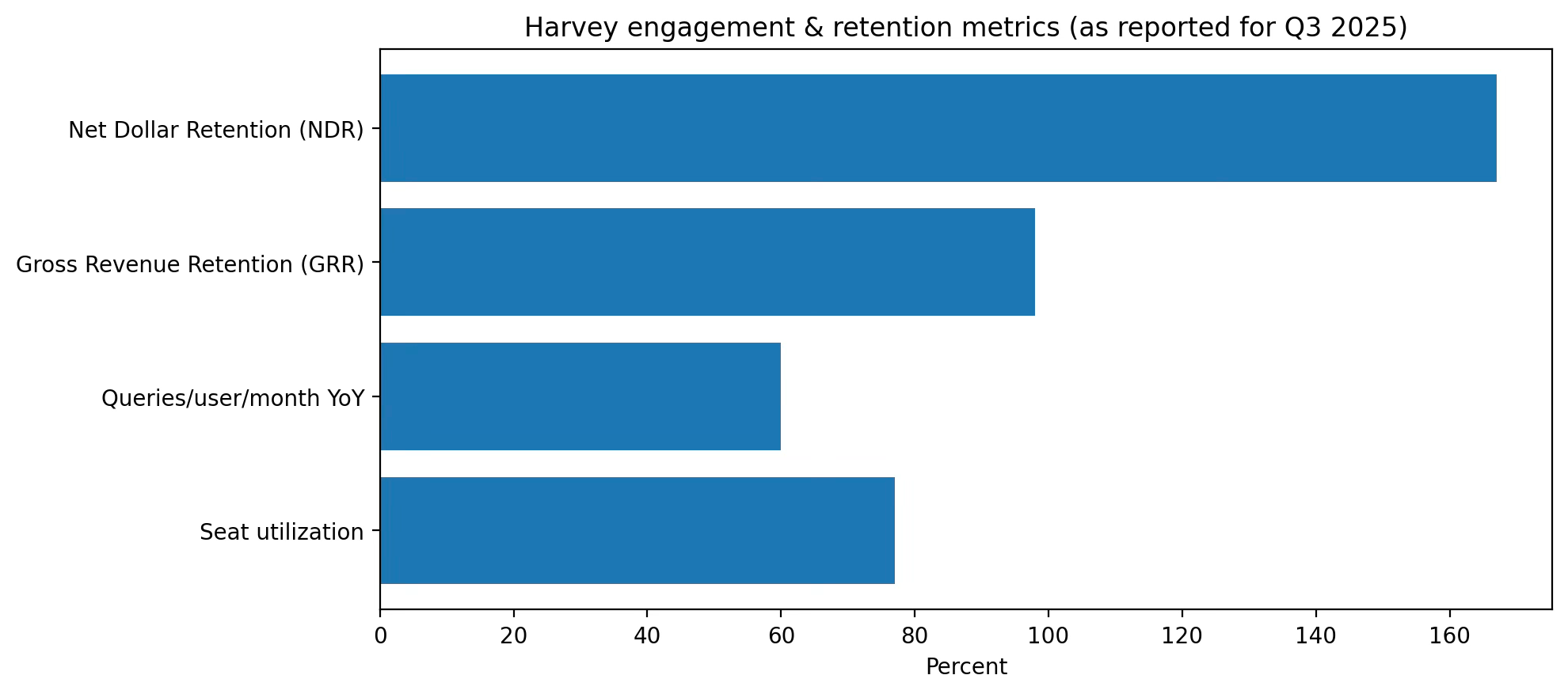 Harvey is building an enterprise SaaS engine: land with a pilot, expand to firmwide adoption, then expand across departments and geographies. The retention metrics Harvey reports (98% GRR, 167% NDR in Q3 2025) are the signature of that playbook working.