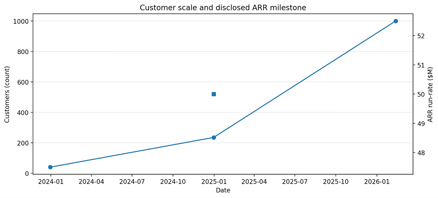 On the financial side, Harvey disclosed a run-rate ARR of $50M by the end of 2024, with 235 customers across 42 countries at that time. That implies an average of ~$213K run-rate ARR per customer in that snapshot (a rough average across very different customer sizes).