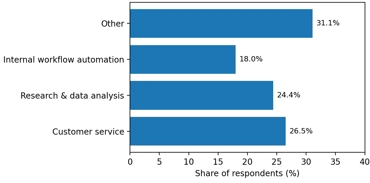 LangChain makes clear where agents are most valuable today: customer service and research/data analysis lead, with internal workflow automation close behind.