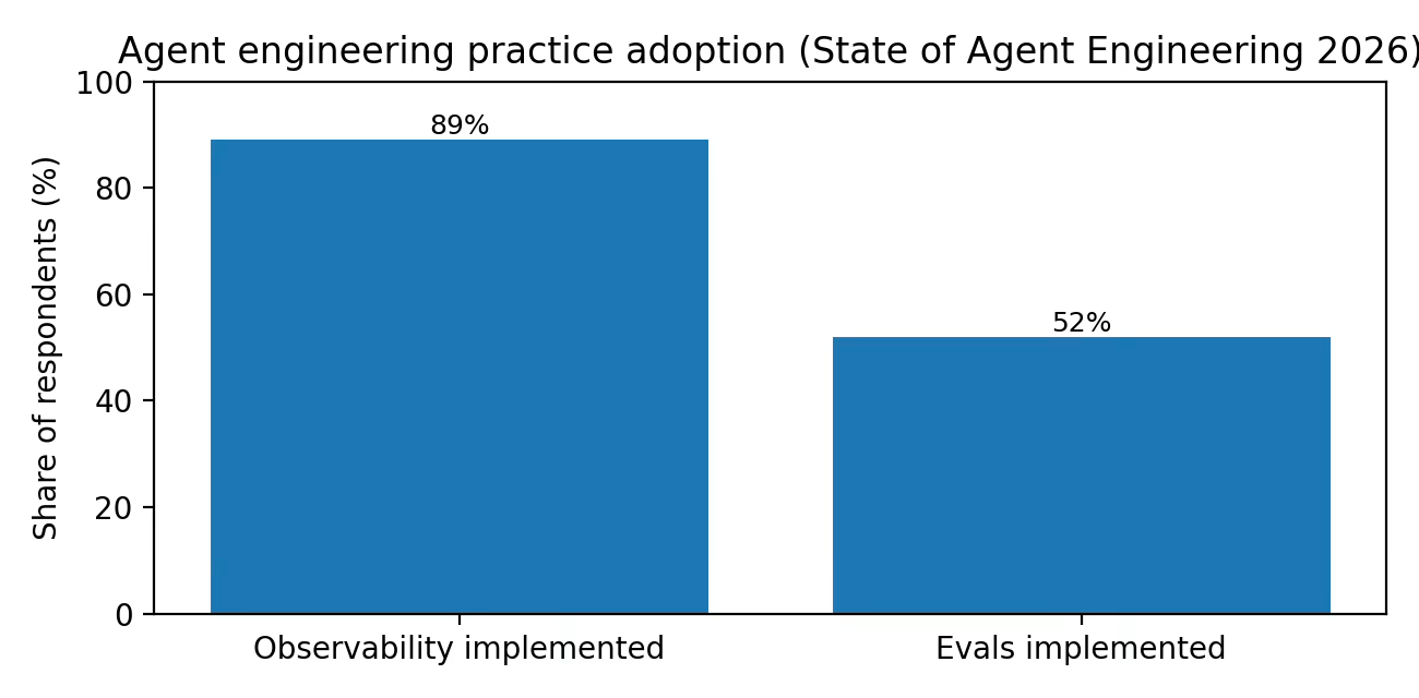2026: The discipline hardens. LangChain’s survey reports majority production usage and near-universal observability adoption among teams building agents.