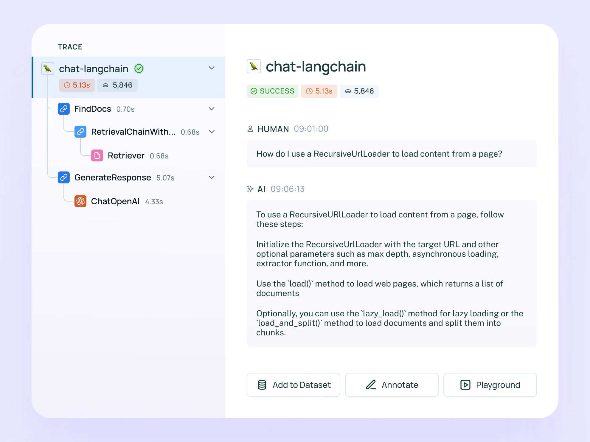 Turn production into labeled data: promote interesting traces into datasets, attach human feedback, and run evals on changes before shipping.