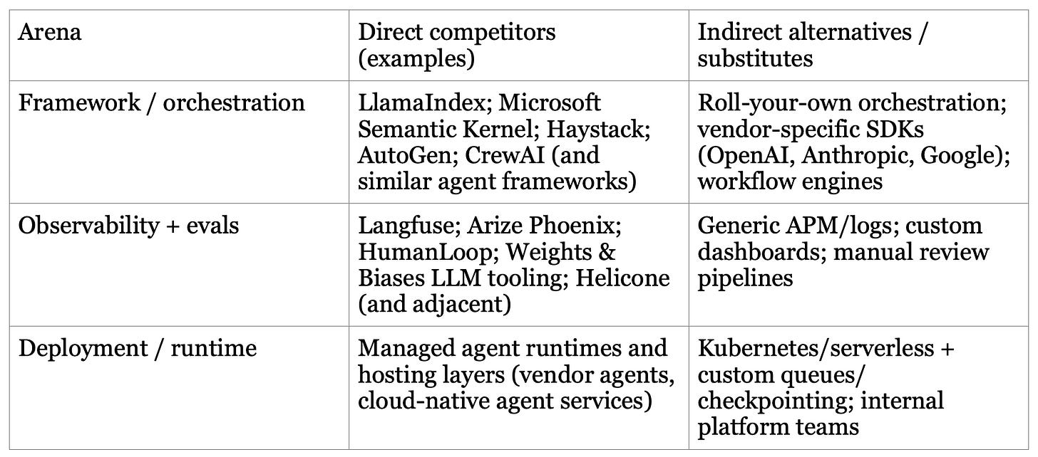 LangChain competes in three arenas at once (framework, lifecycle tooling, deployment). That means it faces different competitors depending on where you slice the stack:
