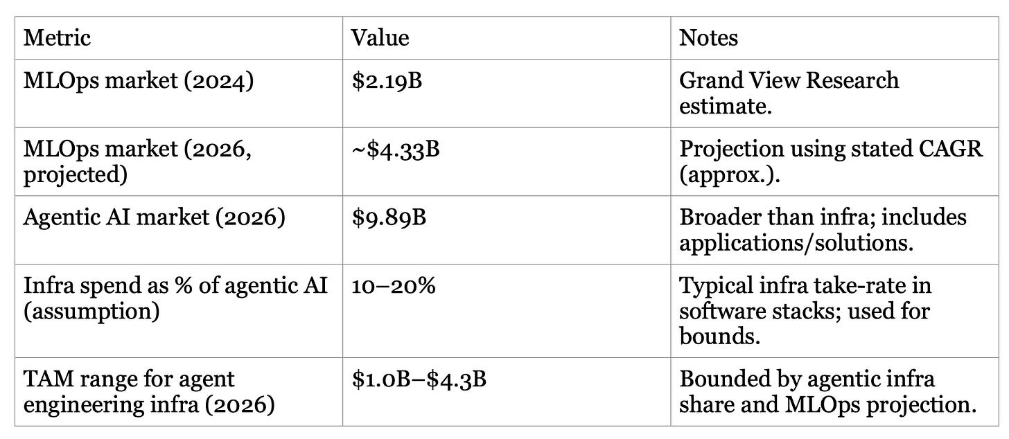 Bottom-up SAM and SOM are even more assumption-heavy. A useful anchor is the company’s own scale signals: as of early 2024 LangSmith reported 5K monthly active teams; by Oct 2025 LangChain reported 35% of the Fortune 500 uses its services. A conservative bottom-up SAM framing is: enterprises and mid-market teams actively running agents in production that require tracing, evals, and deployment. If we assume 25–40% of the broader MLOps category maps to agent engineering in 2026, SAM lands around $1.1B–$1.7B. A plausible SOM for a category leader might be 10–20% share over time; LangChain’s open-source distribution (and existing large-enterprise penetration) makes this credible, but not guaranteed.