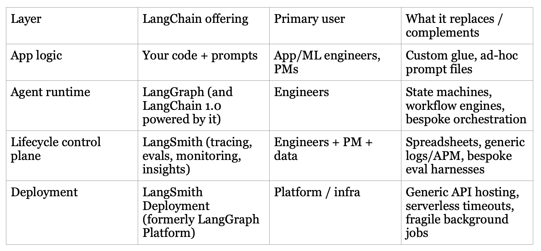 2025: Deployment becomes the next bottleneck; LangGraph Platform (later LangSmith Deployment) reaches GA; by Oct 2025, LangChain announces 1.0 releases and positions itself as a full platform.