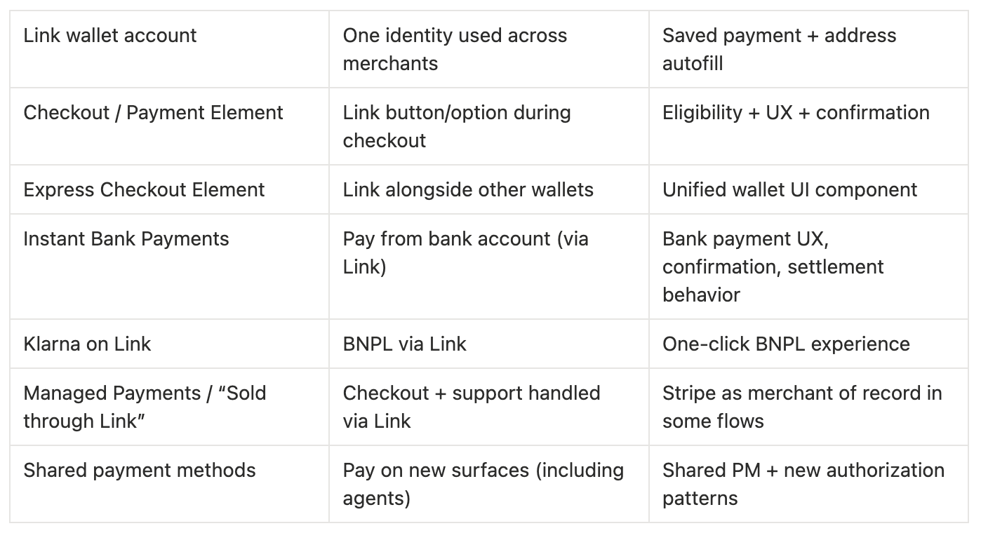 Link is a consumer wallet that shows up in multiple Stripe product surfaces. The most useful way to think about it is as an identity layer plus a set of payment-method frontends.