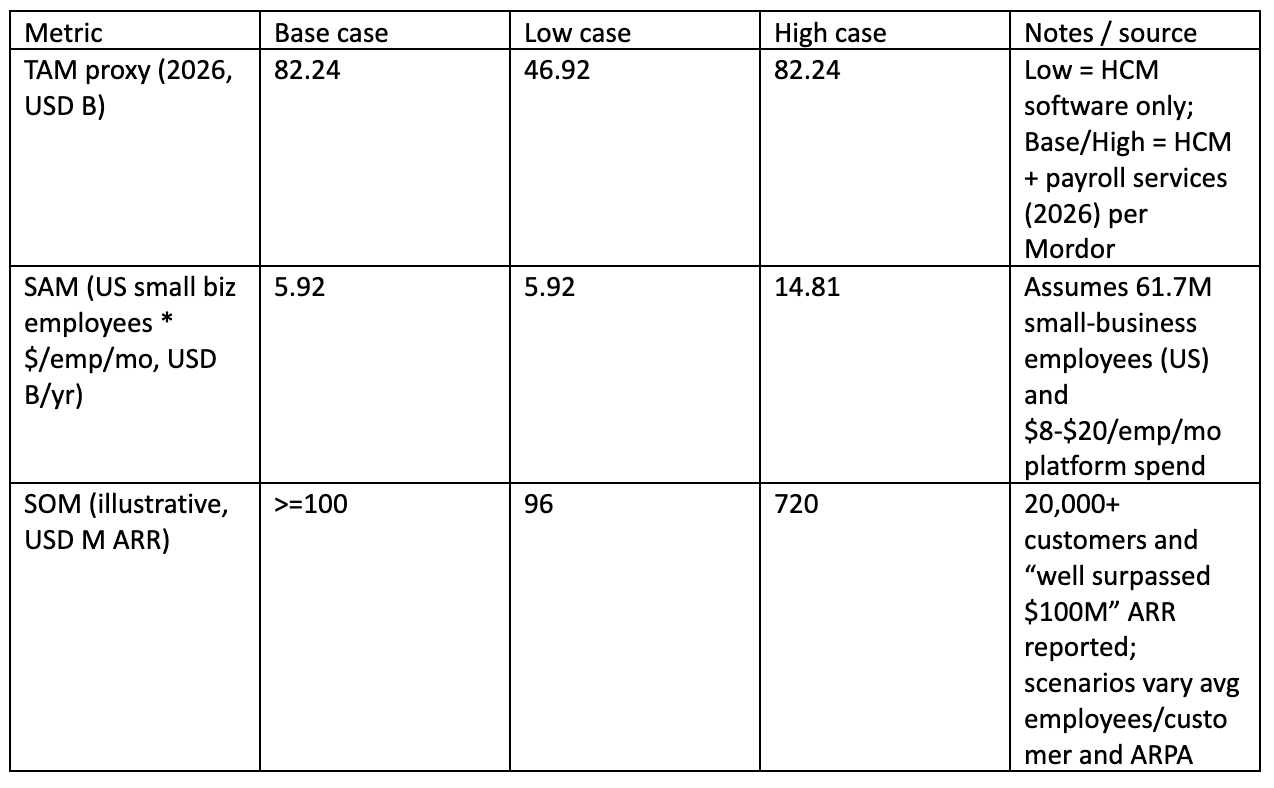 SAM/SOM are scenario-based. Rippling’s actual SAM depends on how much of the SMB/midmarket it can reach through direct sales and partners, attach rate across modules, and international footprint. None of those are fully disclosed.
