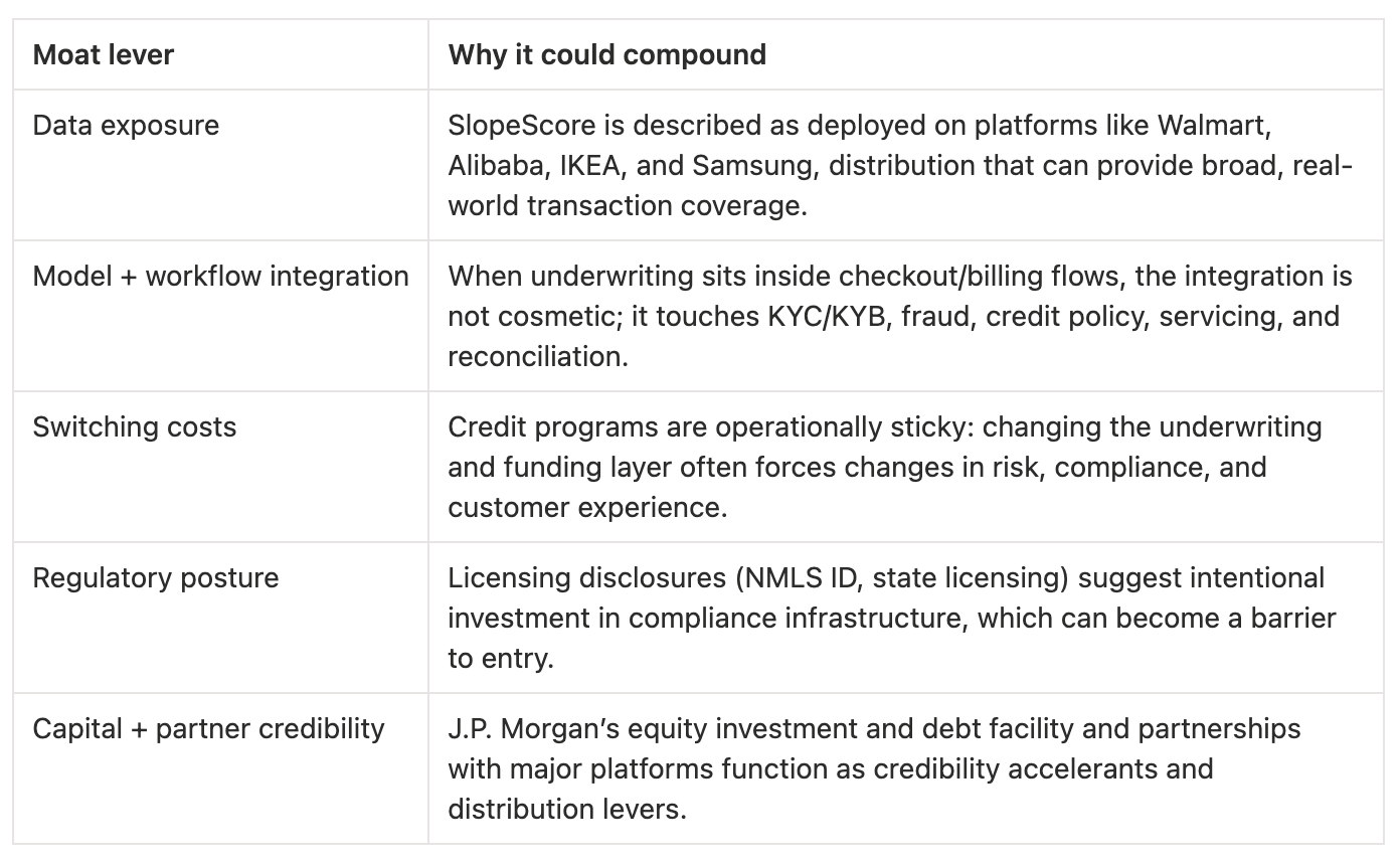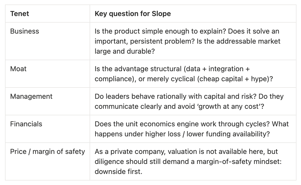 Buffett’s default move is to ask whether a business has an enduring advantage that gets stronger with time. Slope makes the case that the advantage is the capital pool and transaction understanding: a specialized model that turns messy bank data into credit-grade signals at scale.