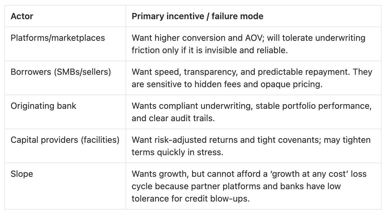 Incentives: are underwriting standards aligned between Slope, the originating bank, and distribution platforms?