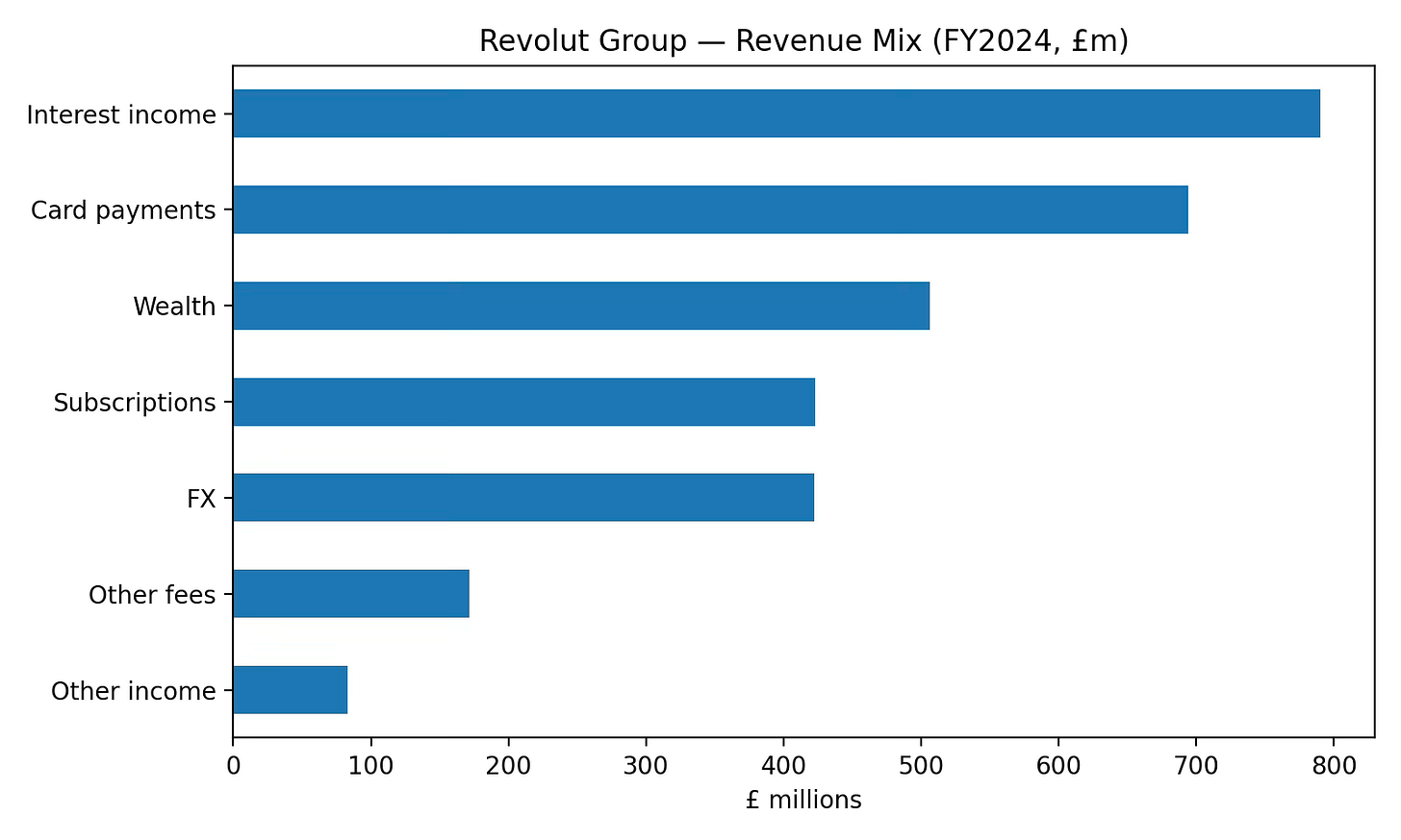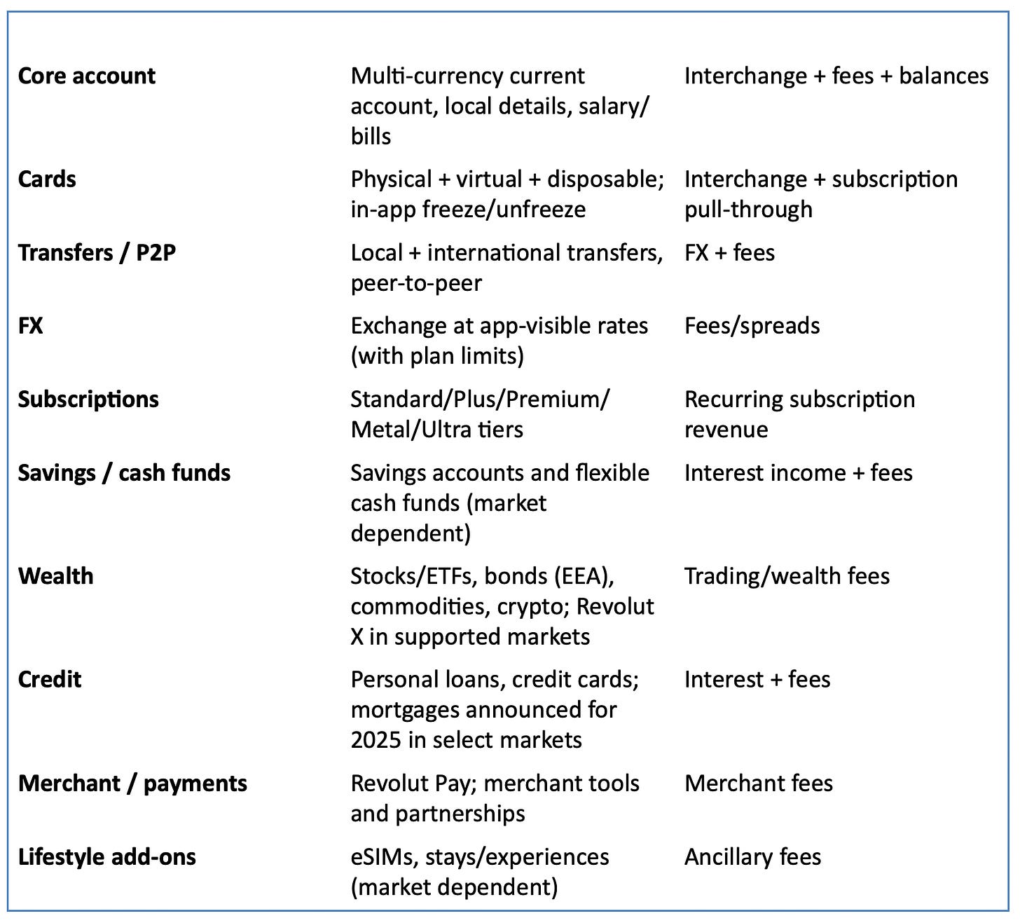 Revolut’s model is multi‑line revenue + primary‑account behavior. The business is a portfolio of money flows. The strategy is to become the default interface (balances + daily spend), then attach higher‑margin products over time.