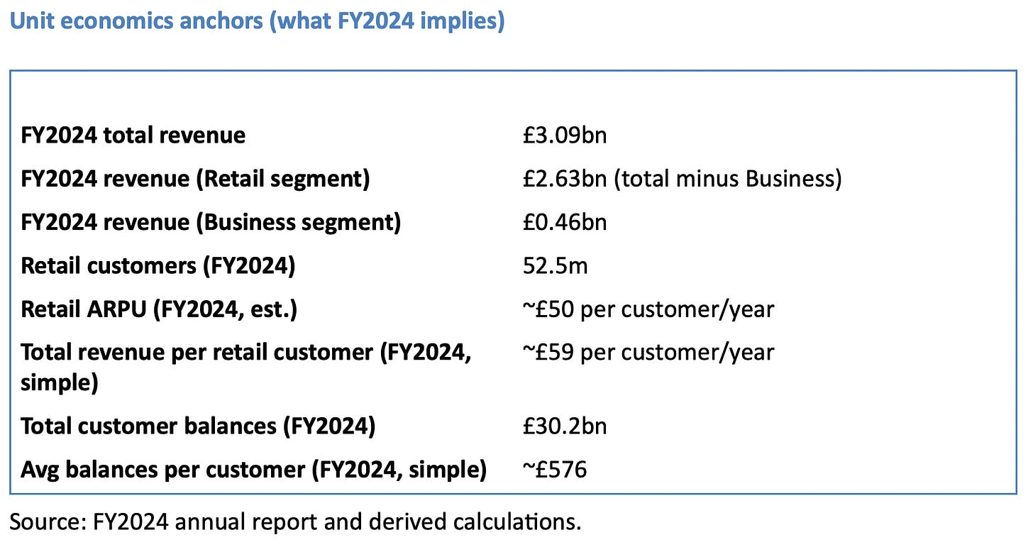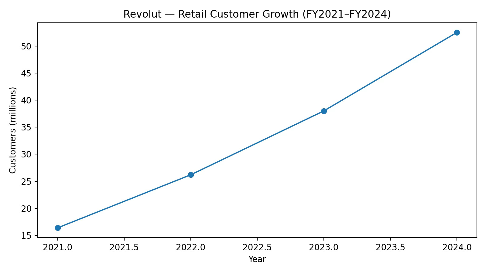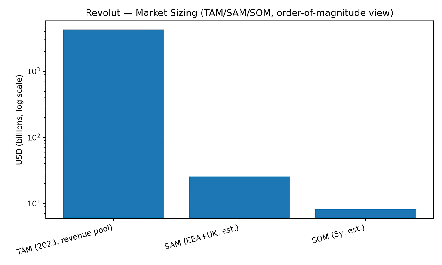 SOM (serviceable obtainable): Revolut’s own published ambition is 100 million customers by mid‑2027. Using the same FY2024 unit economics (and holding them flat), 100m customers implies ~£5.0B in retail revenue; adding Business and other segments yields an order‑of‑magnitude revenue run‑rate of ~£6B (~$8.2B).