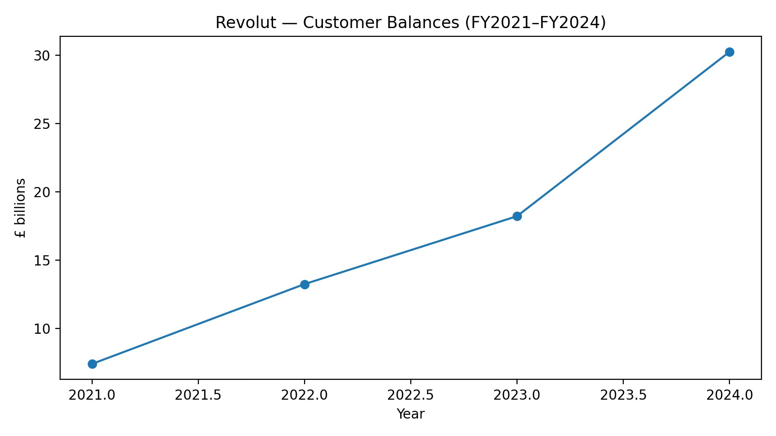 Revolut’s balance sheet is now large enough that it shapes strategy. At 31 Dec 2024, total assets were £25.85bn. Customer liabilities (deposits + e‑money and related customer balances) were £22.54bn, and equity was £2.57bn. The cash flow statement is dominated by growth in customer liabilities (deposits and e‑money), which is mechanically reflected as operating cash inflow. In FY2024, net cash from operating activities was £8.12bn and cash and cash equivalents ended the year at £15.91bn.