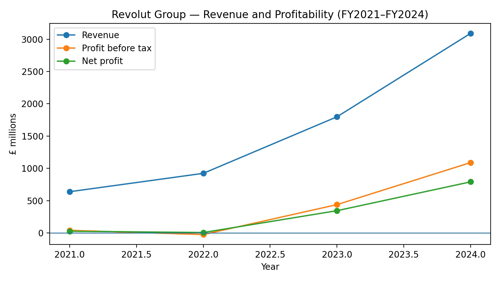Revolut’s P&L tells a simple story: explosive revenue growth plus an increasingly meaningful net interest component. FY2024 revenue was £3.09bn, with profit before tax of £1.09bn and net profit of £0.79bn.